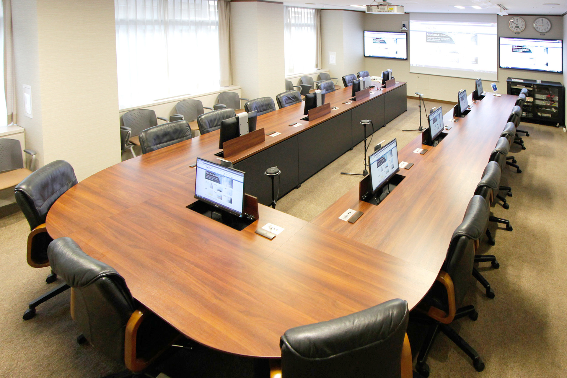 会議室前面には電動スクリーン、両サイドにディスプレイ、WEBカメラが設置されており世界中の複数拠点と繋がっています。そんなグローバルに展開している会議室に機能的かつ重厚感のあるデスクの導入事例となりました